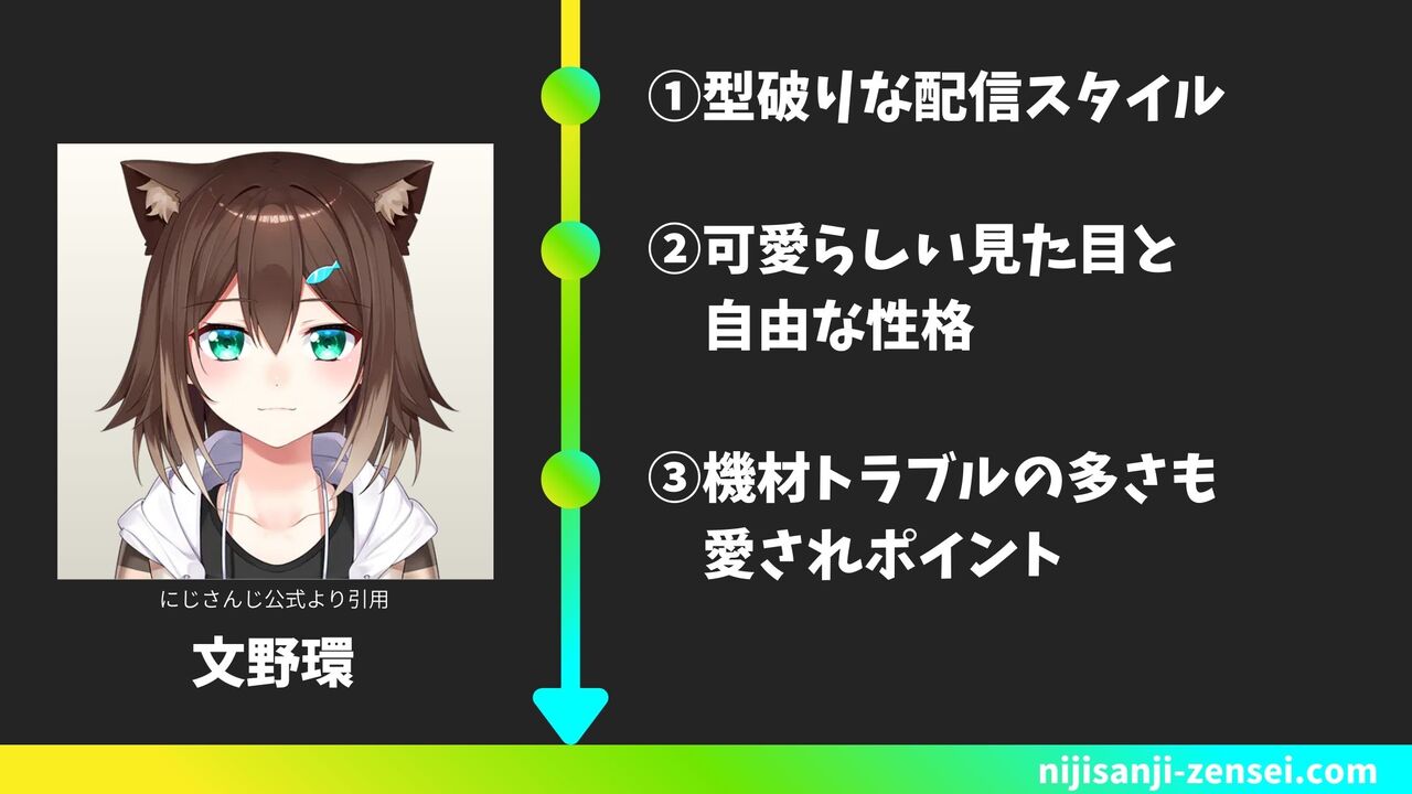 自由な配信スタイルや予測不能な言動で視聴者を楽しませる文野環さんの今後の活躍に期待が高まります!